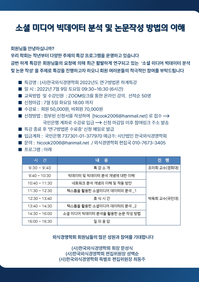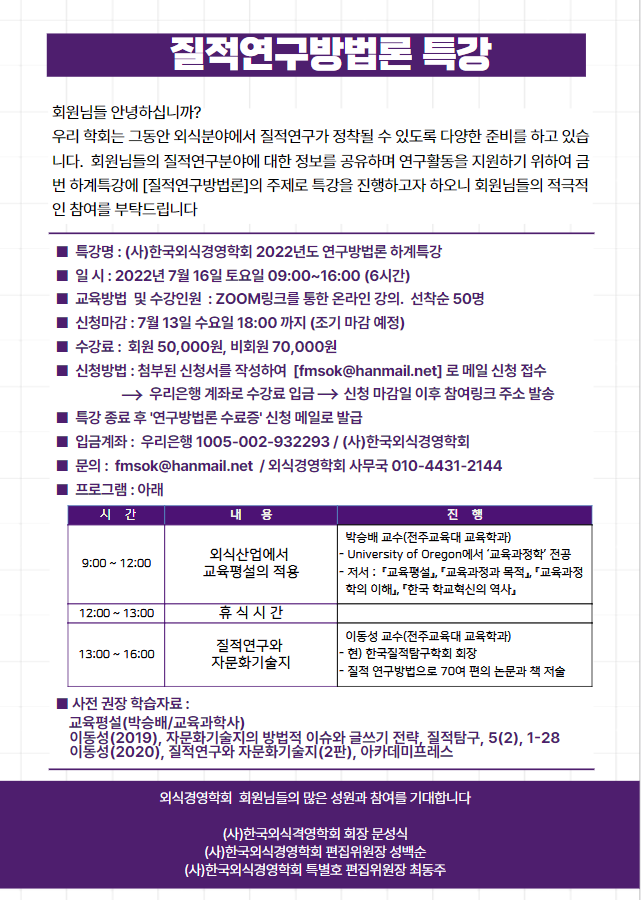 <외식경영연구 질관리위원회>에서는 다음과 같이 2022년도 연구방법론 하계 특강을 실시합니다. 회원 여러분들의 적극적인 참여를 기대합니다.